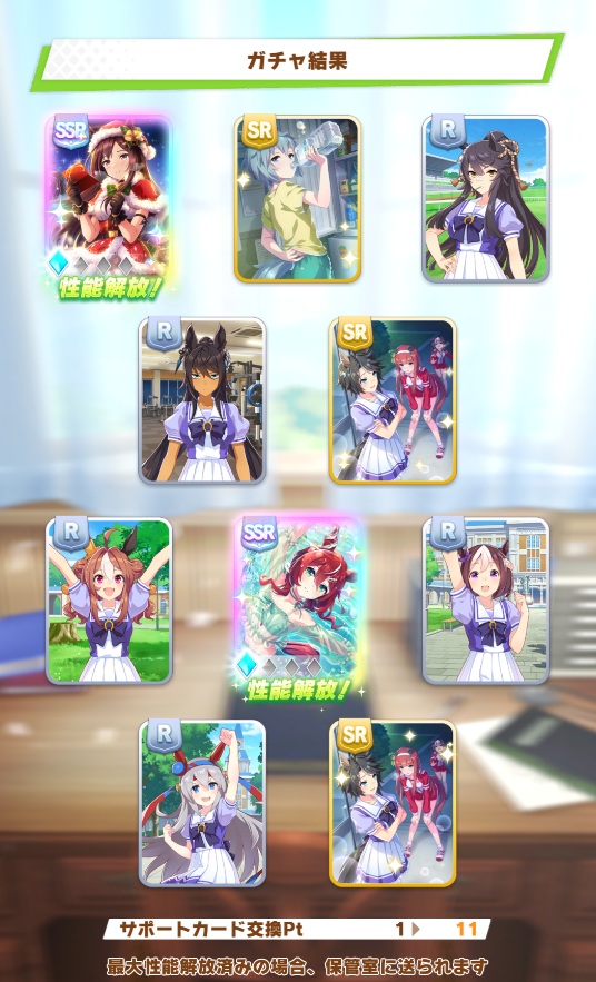 セレクトピックアップ(サポート)ガチャで有償10連1回分がSSR確定、と昨日のブログで恥ずかしい間違いを書いてしまいました。