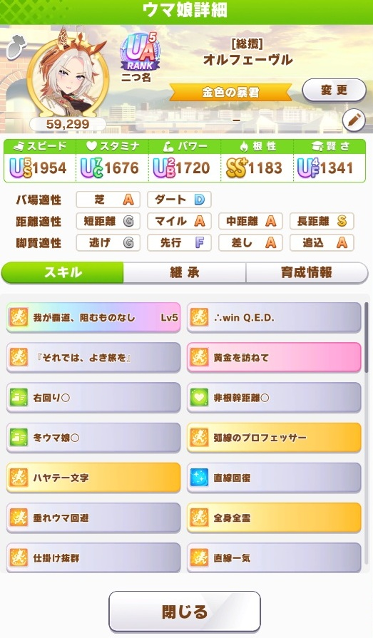 いつもは自分なりに60~70%くらいはプラチナ獲れるであろう(あくまで自分の体感です)っていう水準の育成をしているつもりなんですが、今回は決勝の相手2人ともシングレオグリ+クロノジェネシスだと想定すると、いいとこ50%ってとこかな・・