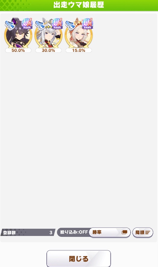 オルフェは先行に比べると追込のサポカ自体が1~2世代遅れをとっていて、なおかつ私が所持しているサポカの凸数も中途半端で、3人の中で最も満足な育成ができなかった娘。
